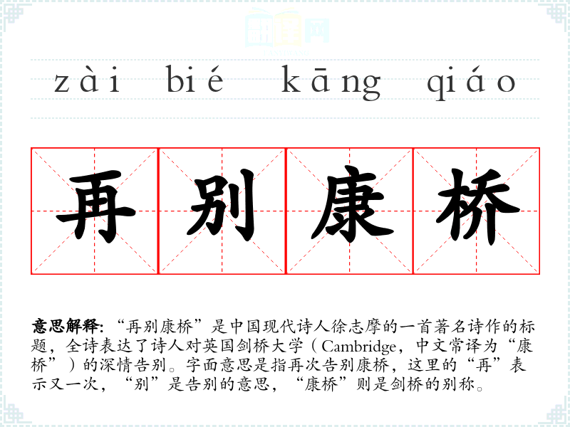 “再别康桥”是**现代诗人徐志摩的一首著名诗作的标题,全诗表达了诗人对英国剑桥大学(Cambridge,中文常译为“康桥”)的深情告别。字面意思是指再次告别康桥,这里的“再”表示又一次,“别”是告别的意思,“康桥”则是剑桥的别称。