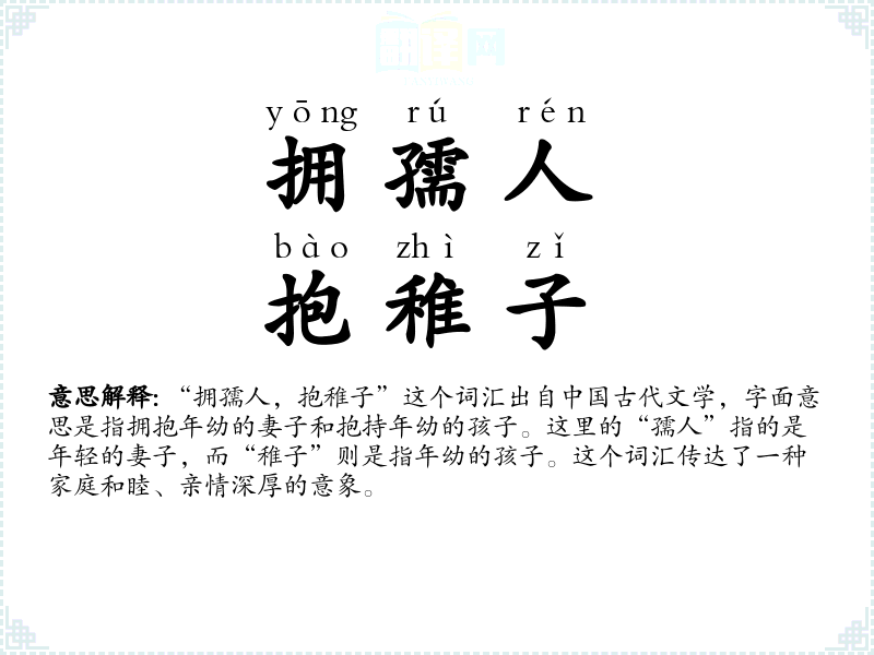 “拥孺人,抱稚子”这个词汇出自**古代文学,字面意思是指拥抱年幼的妻子和抱持年幼的孩子。这里的“孺人”指的是年轻的妻子,而“稚子”则是指年幼的孩子。这个词汇传达了一种家庭和睦、亲情深厚的意象。