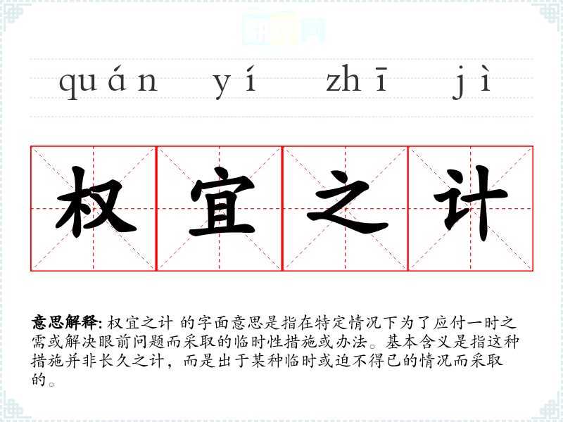 权宜之计 的字面意思是指在特定情况下为了应付一时之需或解决眼前问题而采取的临时性措施或办法。基本含义是指这种措施并非长久之计,而是出于某种临时或迫不得已的情况而采取的。
