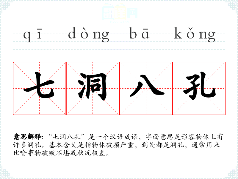 “七洞八孔”是一个汉语成语,字面意思是形容物体上有许多洞孔。基本含义是指物体破损严重,到处都是洞孔,通常用来比喻事物破败不堪或状况极差。