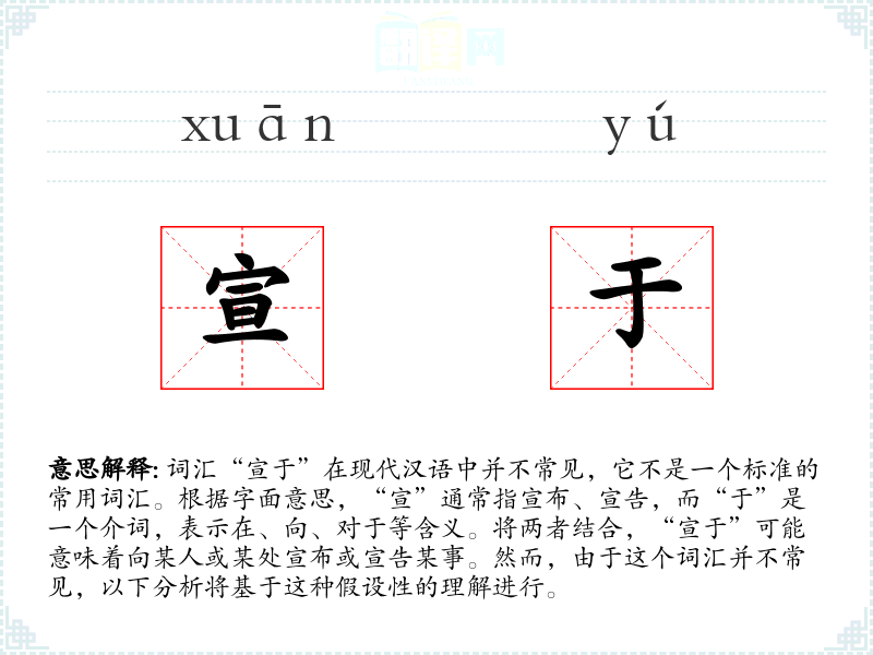 词汇“宣于”在现代汉语中并不常见,它不是一个标准的常用词汇。根据字面意思,“宣”通常指宣布、宣告,而“于”是一个介词,表示在、向、对于等含义。将两者结合,“宣于”可能意味着向某人或某处宣布或宣告某事。然而,由于这个词汇并不常见,以下分析将基于这种假设性的理解进行。