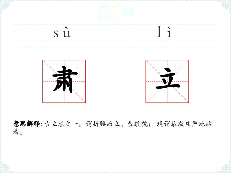 古立容之一。谓折腰而立。恭敬貌; 现谓恭敬庄严地站着。