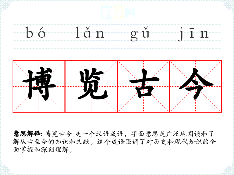 博览古今 是一个汉语成语,字面意思是广泛地阅读和了解从古至今的知识和文献。这个成语强调了对历史和现代知识的全面掌握和深刻理解。