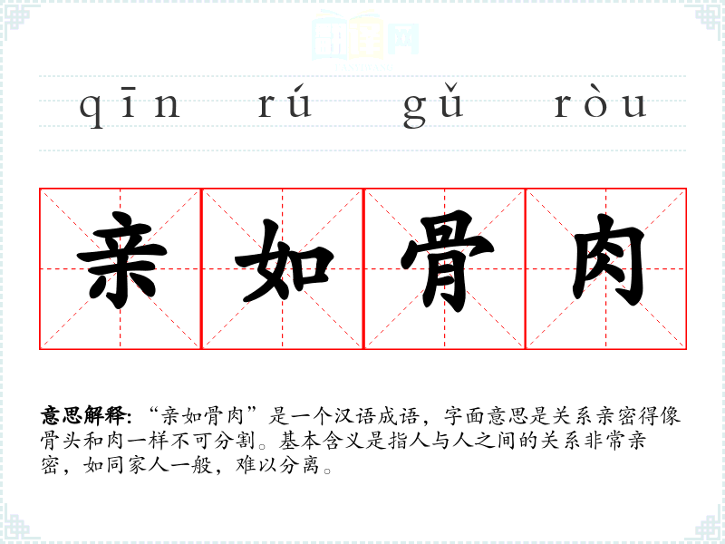 “亲如骨肉”是一个汉语成语,字面意思是关系亲密得像骨头和肉一样不可分割。基本含义是指人与人之间的关系非常亲密,如同家人一般,难以分离。