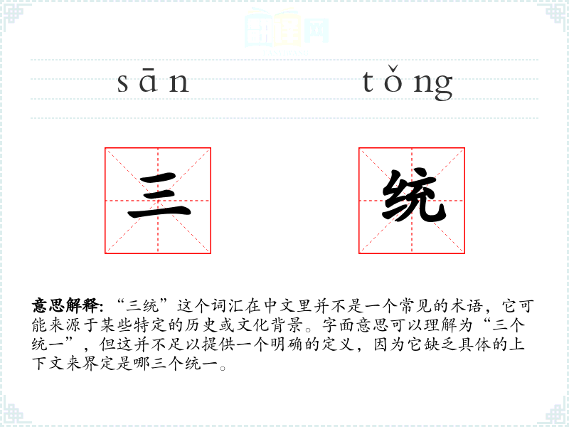 “三统”这个词汇在中文里并不是一个常见的术语,它可能来源于某些特定的历史或文化背景。字面意思可以理解为“三个统一”,但这并不足以提供一个明确的定义,因为它缺乏具体的上下文来界定是哪三个统一。