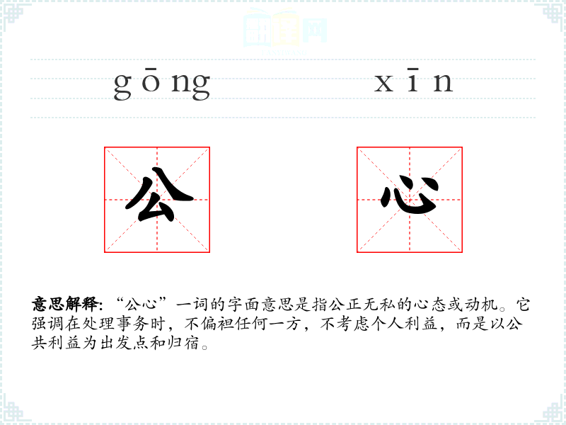 “公心”一词的字面意思是指公正无私的心态或动机。它强调在处理事务时,不偏袒任何一方,不考虑个人利益,而是以公共利益为出发点和归宿。