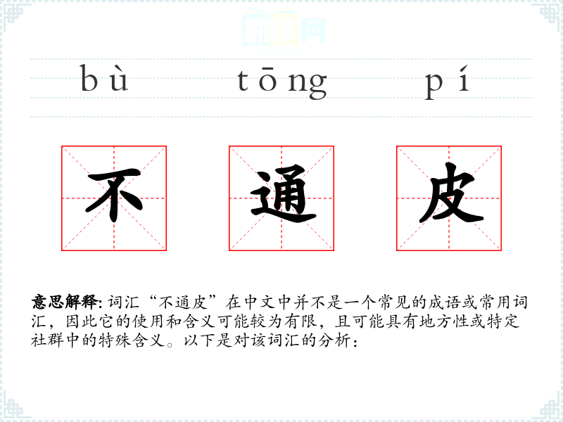 词汇“不通皮”在中文中并不是一个常见的成语或常用词汇,因此它的使用和含义可能较为有限,且可能具有地方性或特定社群中的特殊含义。以下是对该词汇的分析: