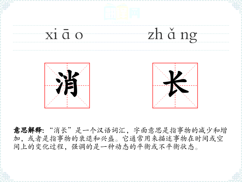 “消长”由两个汉字组成,“消”意味着减少或消失,“长”意味着增加或生长。这个词在古代汉语中就已经存在,用来描述自然和社会现象的变化。随着时间的推移,它的使用范围和语境有所扩展,但基本含义保持不变。