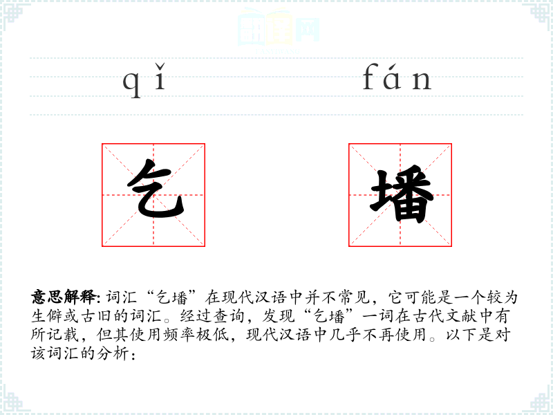 词汇“乞墦”在现代汉语中并不常见,它可能是一个较为生僻或古旧的词汇。经过查询,发现“乞墦”一词在古代文献中有所记载,但其使用频率极低,现代汉语中几乎不再使用。以下是对该词汇的分析:
