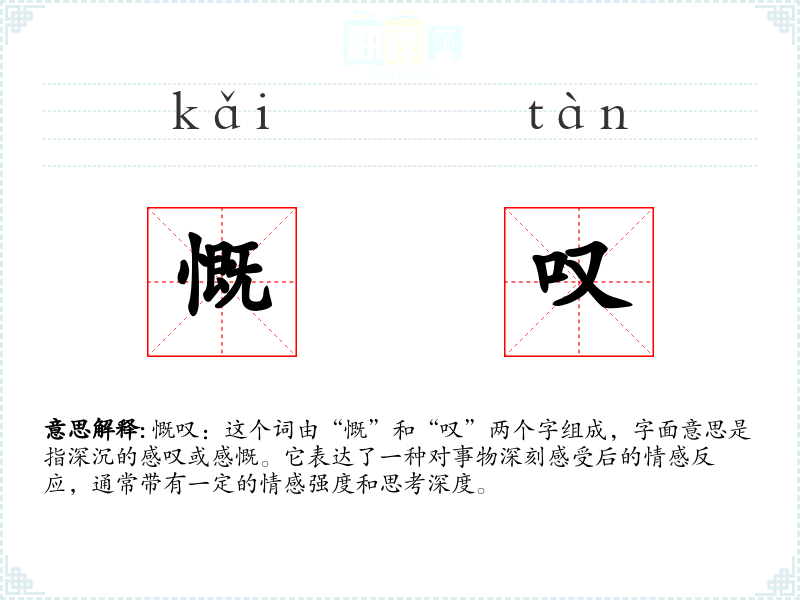 慨叹:这个词由“慨”和“叹”两个字组成,字面意思是指深沉的感叹或感慨。它表达了一种对事物深刻感受后的情感反应,通常带有一定的情感强度和思考深度。