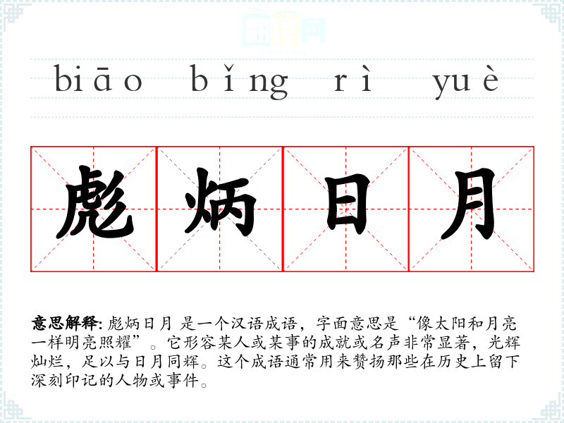 彪炳日月 是一个汉语成语,字面意思是“像太阳和月亮一样明亮照耀”。它形容某人或某事的成就或名声非常显著,光辉灿烂,足以与日月同辉。这个成语通常用来赞扬那些在历史上留下深刻印记的人物或**。