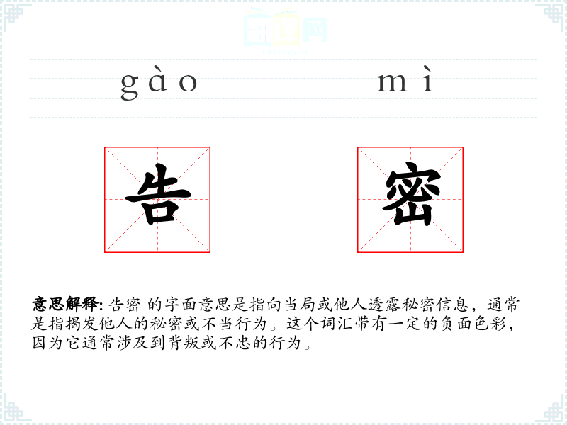 告密 的字面意思是指向当局或他人透露秘密信息,通常是指揭发他人的秘密或不当行为。这个词汇带有一定的负面色彩,因为它通常涉及到背叛或不忠的行为。