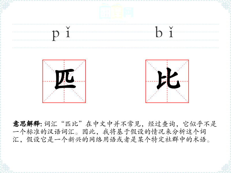 词汇“匹比”在中文中并不常见,经过查询,它似乎不是一个标准的汉语词汇。因此,我将基于假设的情况来分析这个词汇,假设它是一个新兴的网络用语或者是某个特定社群中的术语。