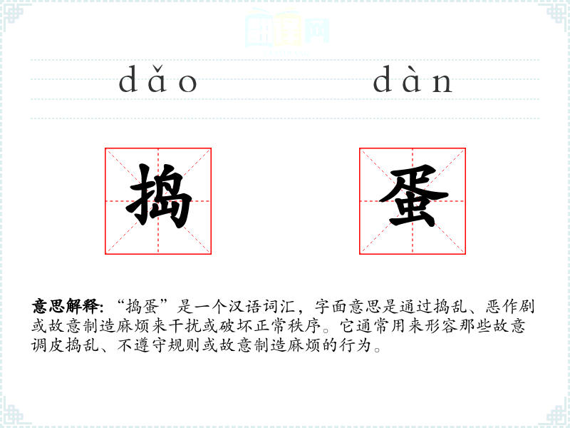 “捣蛋”是一个汉语词汇,字面意思是通过捣乱、恶作剧或故意制造麻烦来干扰或破坏正常秩序。它通常用来形容那些故意调皮捣乱、不遵守规则或故意制造麻烦的行为。