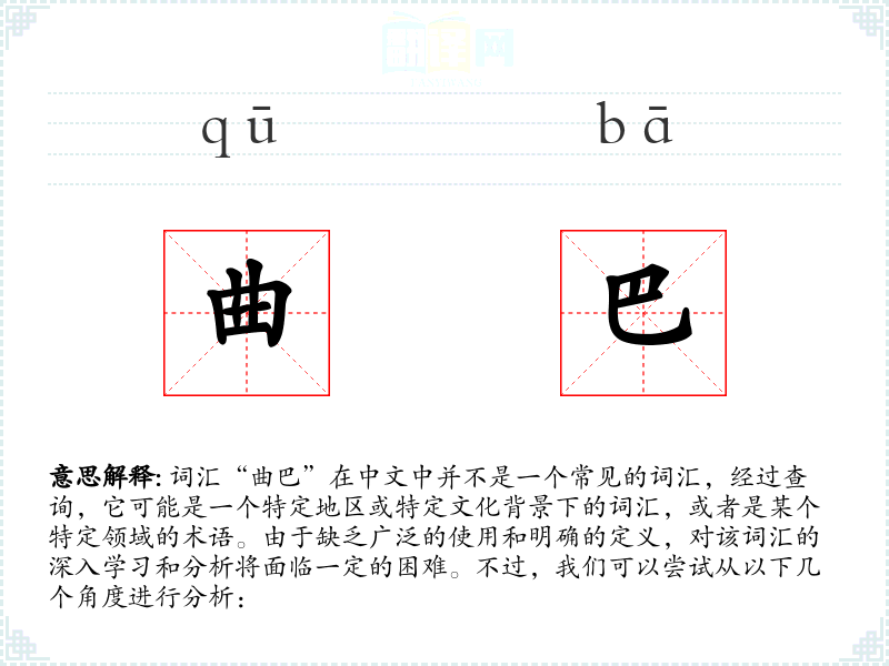 由于“曲巴”不是一个标准的中文词汇,我们无法提供一个确切的字面意思和基本含义。它可能是某个地方方言中的词汇,或者是某个特定群体的内部用语。