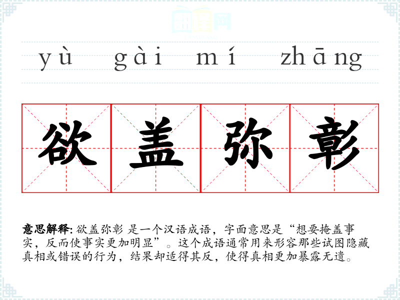 欲盖弥彰 是一个汉语成语,字面意思是“想要掩盖事实,反而使事实更加明显”。这个成语通常用来形容那些试图隐藏真相或错误的行为,结果却适得其反,使得真相更加暴露无遗。