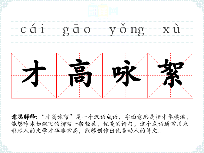 “才高咏絮”这个成语的来源并不明确,但它显然是受到**古代文学中对才华和诗意的赞美传统的影响。在古代文学作品中,经常可以看到对诗人或文人才华的赞美,这种赞美逐渐形成了固定的表达方式,如“才高咏絮”。