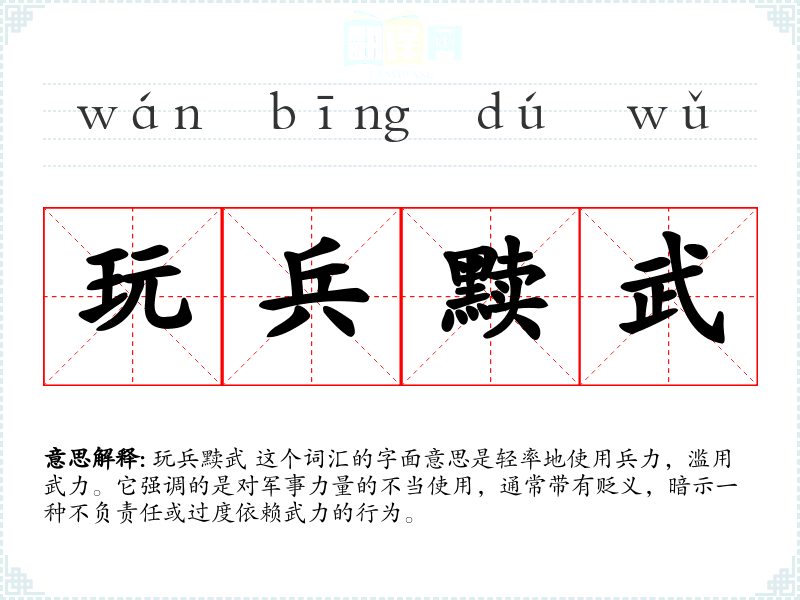 玩兵黩武 这个词汇的字面意思是轻率地使用兵力,滥用武力。它强调的是对军事力量的不当使用,通常带有贬义,暗示一种不负责任或过度依赖武力的行为。