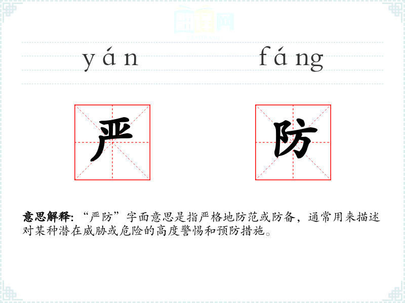 “严防”字面意思是指严格地防范或防备,通常用来描述对某种潜在威胁或危险的高度警惕和预防措施。