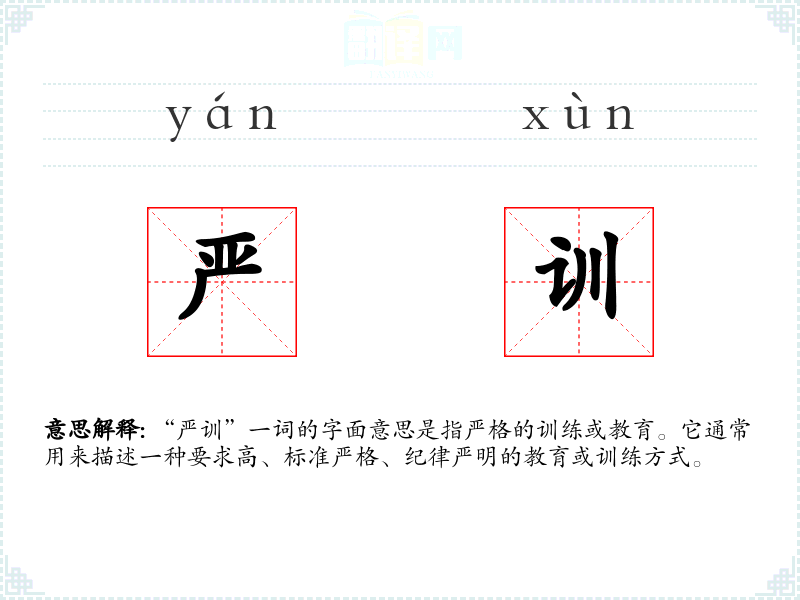 “严训”一词的字面意思是指严格的训练或教育。它通常用来描述一种要求高、标准严格、纪律严明的教育或训练方式。