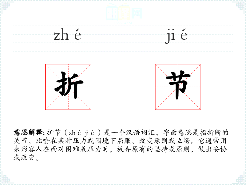 折节(zhé jié)是一个汉语词汇,字面意思是指折断的关节,比喻在某种压力或困境下屈服、改变原则或立场。它通常用来形容人在面对困难或压力时,放弃原有的坚持或原则,做出妥协或改变。