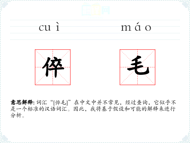 词汇“[倅毛]”在中文中并不常见,经过查询,它似乎不是一个标准的汉语词汇。因此,我将基于假设和可能的解释来进行分析。