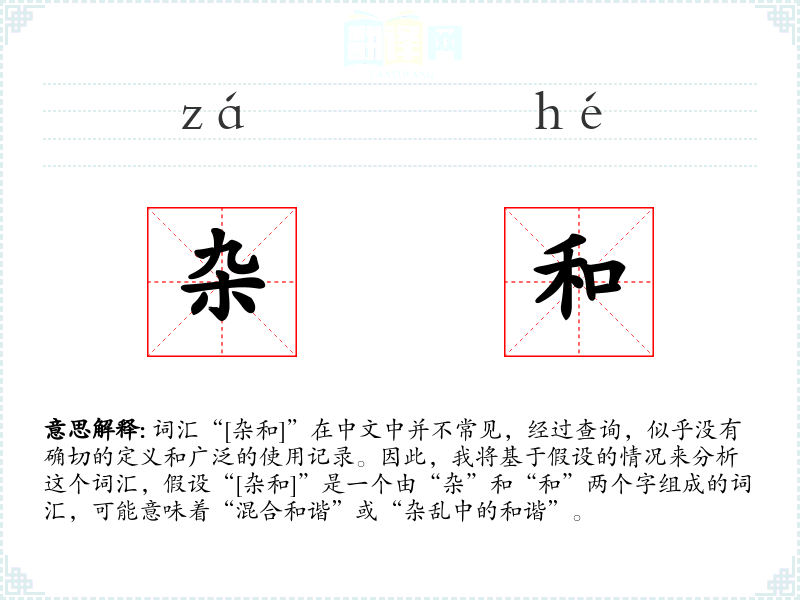 - 专业领域:在设计或艺术领域,“[杂和]”可能指在创作中融合多种风格或元素,形成独特的和谐效果。