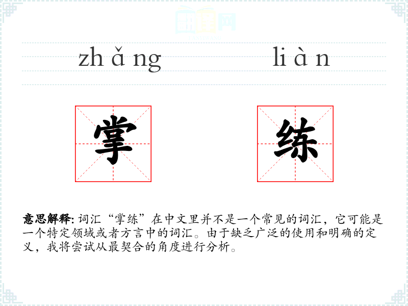 词汇“掌练”在中文里并不是一个常见的词汇,它可能是一个特定领域或者方言中的词汇。由于缺乏广泛的使用和明确的定义,我将尝试从最契合的角度进行分析。