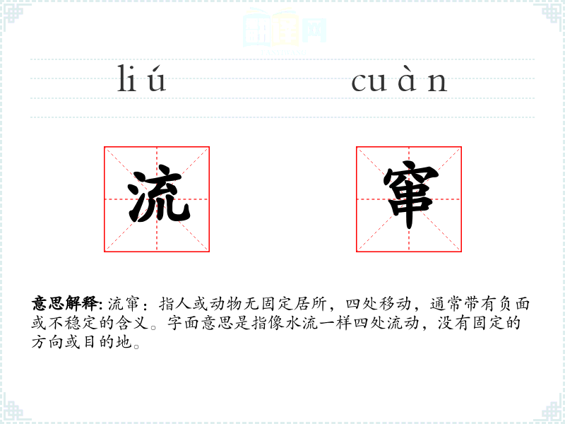 流窜:指人或动物无固定居所,四处移动,通常带有负面或不稳定的含义。字面意思是指像水流一样四处流动,没有固定的方向或目的地。
