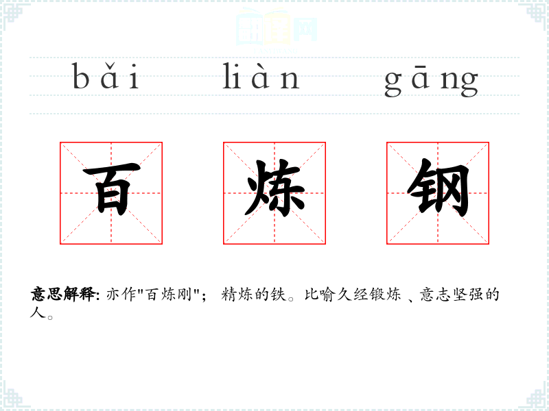 亦作"百炼刚"; 精炼的铁。比喻久经锻炼﹑意志坚强的人。