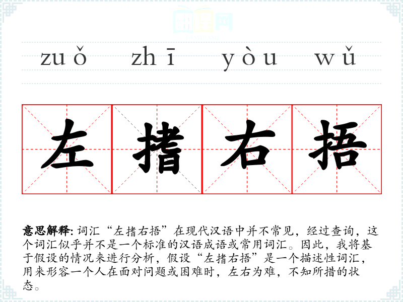 词汇“左搘右捂”在现代汉语中并不常见,经过查询,这个词汇似乎并不是一个标准的汉语成语或常用词汇。因此,我将基于假设的情况来进行分析,假设“左搘右捂”是一个描述性词汇,用来形容一个人在面对问题或困难时,左右为难,不知所措的状态。
