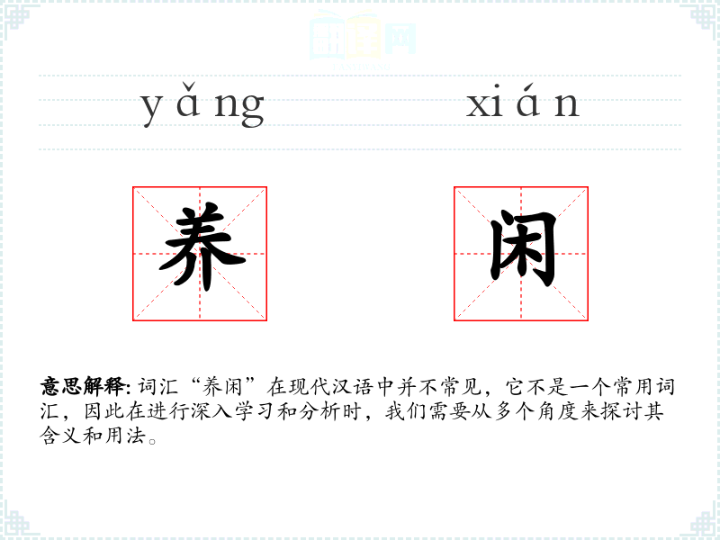 词汇“养闲”在现代汉语中并不常见,它不是一个常用词汇,因此在进行深入学*和分析时,我们需要从多个角度来探讨其含义和用法。