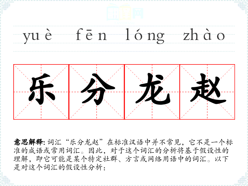 由于“乐分龙赵”不是一个标准词汇,我们无法给出确切的基本定义。如果将其拆分为四个字,每个字的意思分别是: