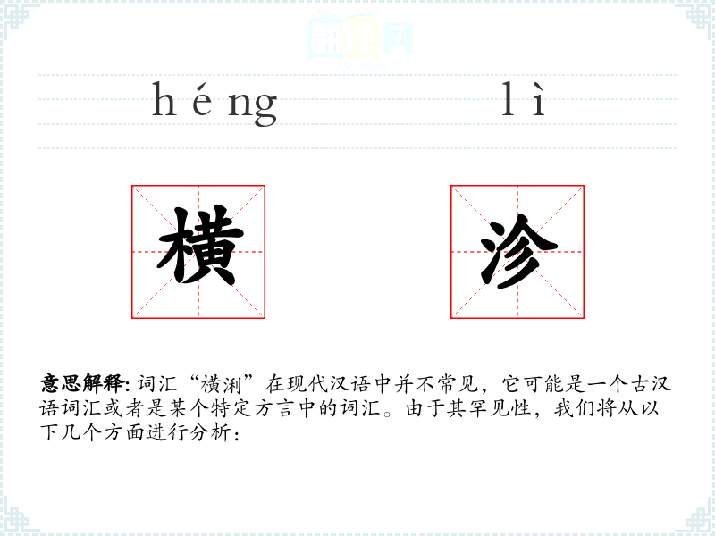 词汇“横浰”在现代汉语中并不常见,它可能是一个古汉语词汇或者是某个特定方言中的词汇。由于其罕见性,我们将从以下几个方面进行分析: