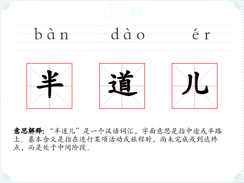 “半道儿”是一个汉语词汇,字面意思是指中途或半路上。基本含义是指在进行某项活动或旅程时,尚未完成或到达终点,而是处于中间阶段。