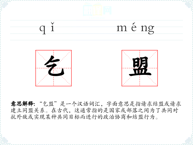 - 专业领域:在国际关系或政治学领域,“乞盟”可以指代国家之间的联盟建立过程,特别是在面临共同威胁时的外交策略。