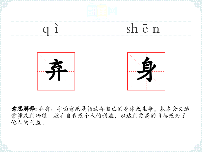 弃身:字面意思是指放弃自己的身体或生命。基本含义通常涉及到牺牲、放弃自我或个人的利益,以达到更高的目标或为了他人的利益。