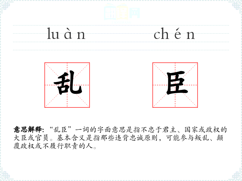 “乱臣”一词的字面意思是指不忠于君主、国家或政权的大臣或官员。基本含义是指那些违背忠诚原则,可能参与叛乱、颠覆政权或不履行职责的人。