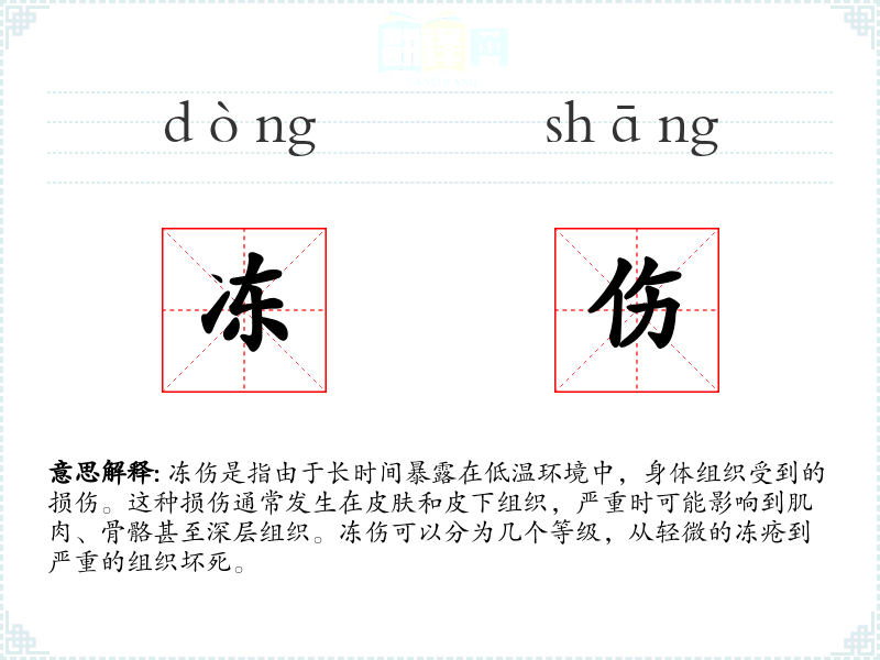 - 反义词:烧伤、烫伤(这些是高温引起的损伤,与冻伤形成对比)