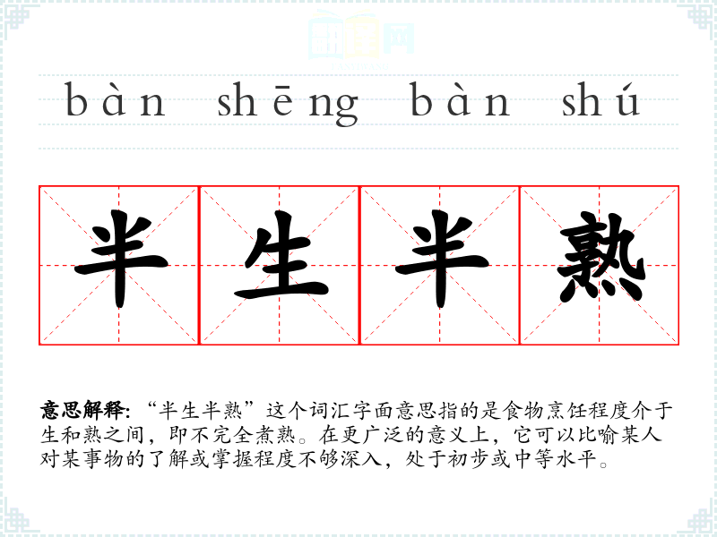 “半生半熟”这个词汇字面意思指的是食物烹饪程度介于生和熟之间,即不完全煮熟。在更广泛的意义上,它可以比喻某人对某事物的了解或掌握程度不够深入,处于初步或中等水平。
