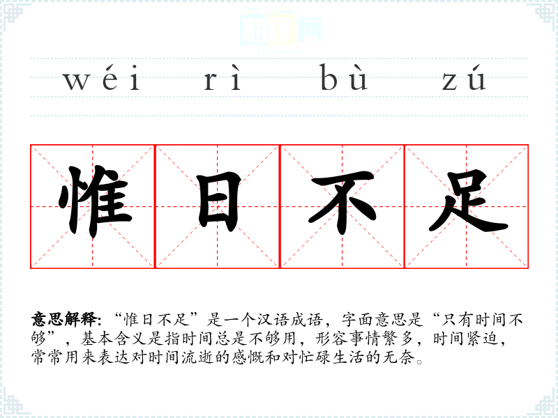 “惟日不足”是一个汉语成语,字面意思是“只有时间不够”,基本含义是指时间总是不够用,形容事情繁多,时间紧迫,常常用来表达对时间流逝的感慨和对忙碌生活的无奈。