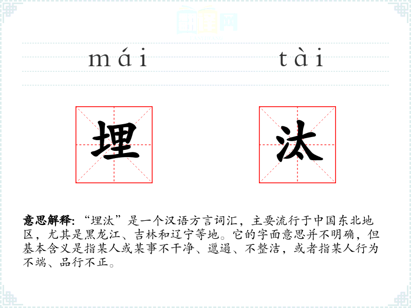 “埋汰”是一个汉语方言词汇,主要流行于**东北地区,尤其是黑龙江、吉林和辽宁等地。它的字面意思并不明确,但基本含义是指某人或某事不干净、邋遢、不整洁,或者指某人行为不端、品行不正。
