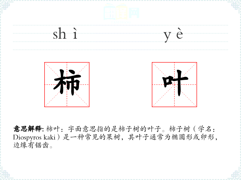 柿叶:字面意思指的是柿子树的叶子。柿子树(学名:Diospyros kaki)是一种常见的果树,其叶子通常为椭圆形或卵形,边缘有锯齿。
