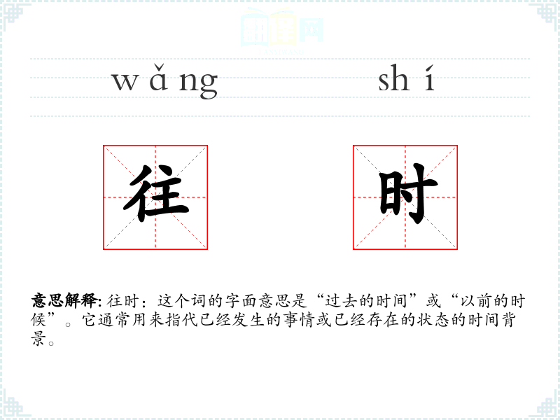 往时:这个词的字面意思是“过去的时间”或“以前的时候”。它通常用来指代已经发生的事情或已经存在的状态的时间背景。