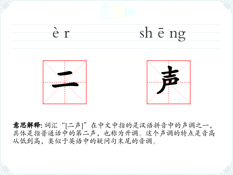- 字面意思和基本含义:在汉语拼音系统中,“二声”表示一个音节的声调特征,即发音时声音从低到高上升。