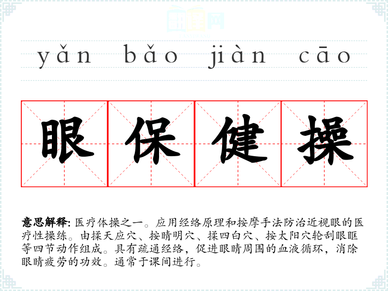 1.医疗体操之一。应用经络原理和按摩手法防治近视眼的医疗性操练。由揉天应穴、按睛明穴、揉四白穴、按太阳穴轮刮眼眶等四节动作组成。具有疏通经络,促进眼睛周围的血液循环,消除眼睛疲劳的功效。通常于课间进行。