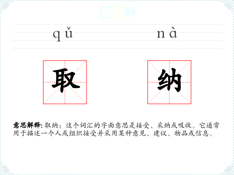 取纳:这个词汇的字面意思是接受、采纳或吸收。它通常用于描述一个人或组织接受并采用某种意见、建议、物品或信息。
