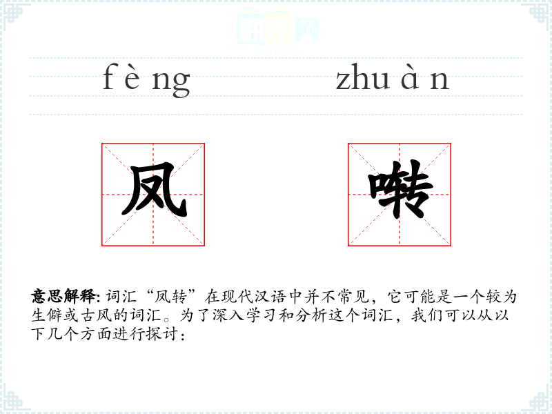 词汇“凤转”在现代汉语中并不常见,它可能是一个较为生僻或古风的词汇。为了深入学*和分析这个词汇,我们可以从以下几个方面进行探讨: