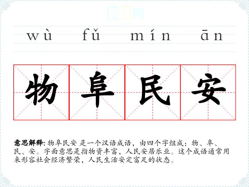物阜民安 是一个汉语成语,由四个字组成:物、阜、民、安。字面意思是指物资丰富,人民安居乐业。这个成语通常用来形容社会经济繁荣,人民生活安定富足的状态。