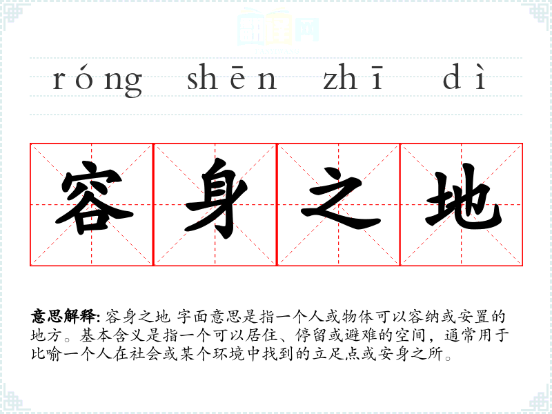 容身之地 字面意思是指一个人或物体可以容纳或安置的地方。基本含义是指一个可以居住、停留或避难的空间,通常用于比喻一个人在社会或某个环境中找到的立足点或安身之所。